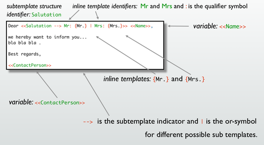There are only two basic structures for parameters: variables and subtemplates. In the example letter, inline subtemplates are used, a special case of subtemplates. The red template notation elements are symbols only. There are no special keywords. The green identifiers can be chosen arbitrarily by the user.
