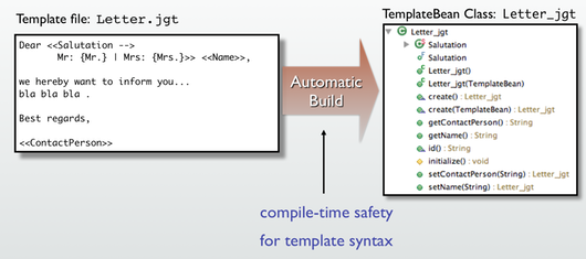 Templates are pre-compiled during automatic build of the IDE into so-called template beans (POJOs). By design, application logic is written in user-defined Java code which uses template beans for the data insertion process. Each template bean can render its contents to a text string by simply calling the toString()-method. If previously generated source files have to be updated, the code generation framework also offers support for protected regions which leave manually written text regions unchanged.