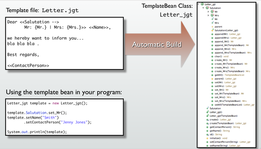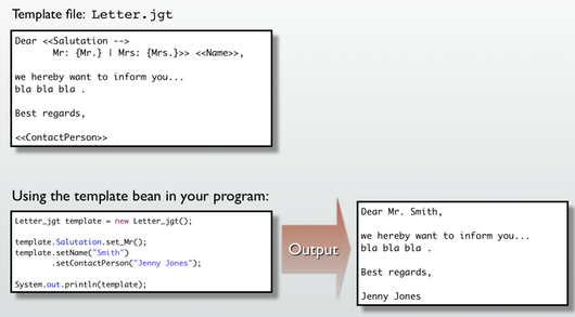 Parameters can be simply filled into the template bean as shown in the lower left part of the next picture. The text representation of the template bean Letter_jgt delivers the template text with inserted parameter values ("Smith", "Jenny Jones") and sub template instances (Mr, Ms). The text representation of sub template Mr via the toString()-method is "Mr.".