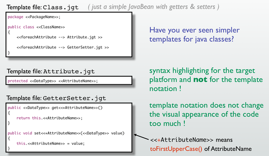 The next example shows a Java class template which uses two additional sub templates: Attribute.jgt & GetterSetter.jgt.