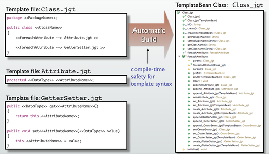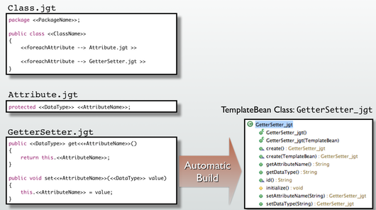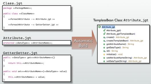 The picture below depicts the translation of the Java class template into the template bean class via automatic build of your IDE.